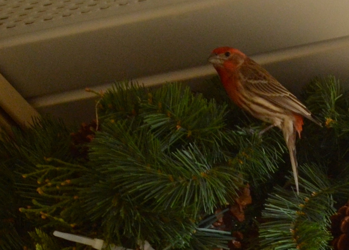 A male house finch chirped and scolded “That’s mine, so back off!” to a twice-his-size robin who was seeking out a place to nest close to where his mate was settled on eggs. After the robin flew away, he stood as a devoted husband protecting his bride from harm.