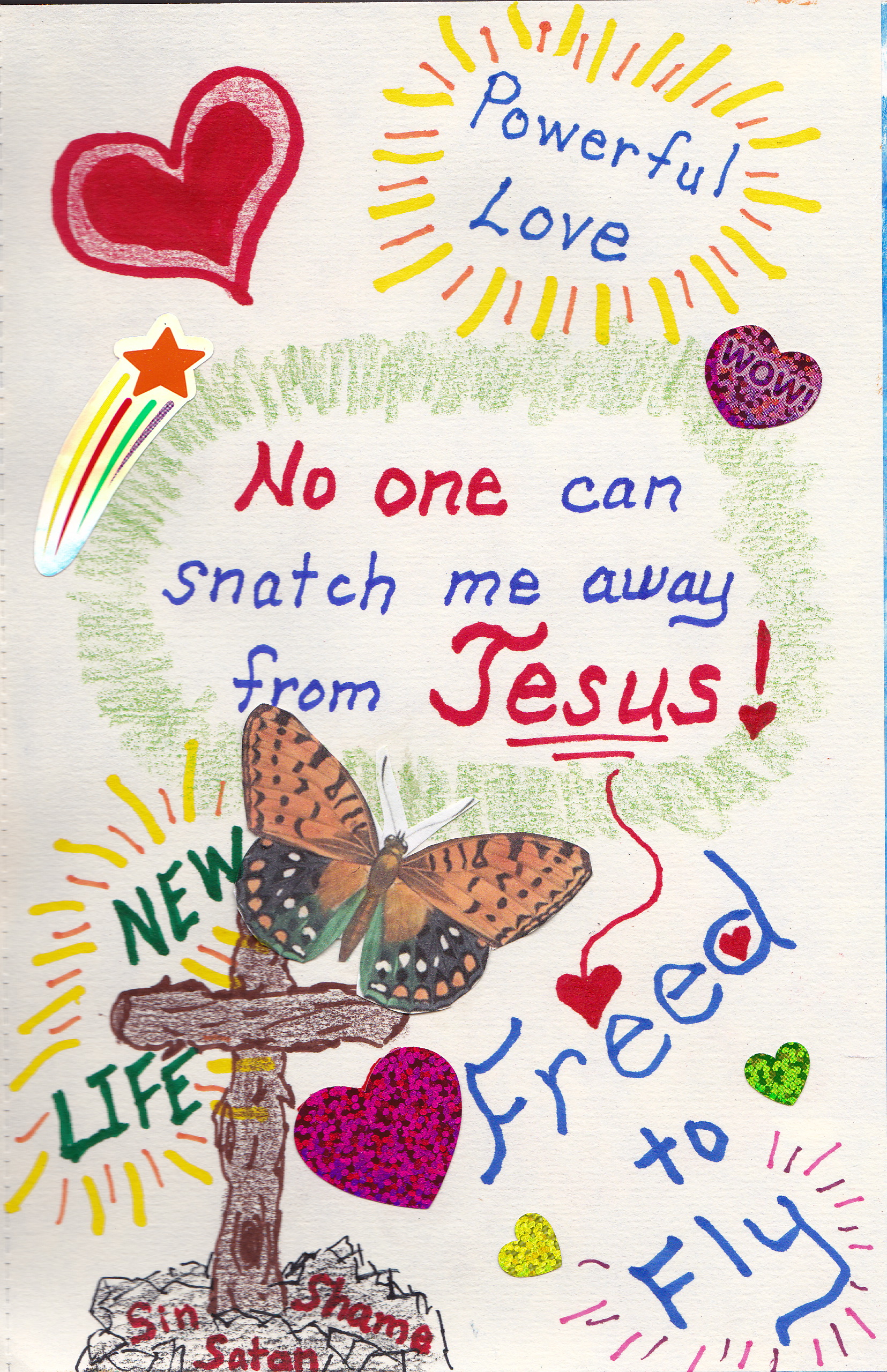 Some days when Satan shoots his fiery darts of self-doubt and self-debasement at us, we have to keep reminding ourselves of God’s Truth. My second page was one of those days… I used markers, colored pencils, stickers and a cut-out butterfly. And as I tried to just let myself go with God’s promises, Satan had to flee, and I felt renewed.