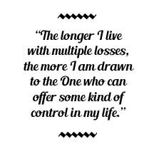 The longer I live with multiple losses, the more I am drawn to the One who can offer some kind of control in my life. I can’t control any of the outward problems I have, but I can trust Him to get me through each situation and show me His love, comfort and humor. I hold tightly to His hand because of His promises. One of the biggest challenges I’ve gone through is financial loss through leaving my teaching career. Sometimes it’s frustrating but God always seems to provide for the things I really need. The rest diminishes in importance after a while.